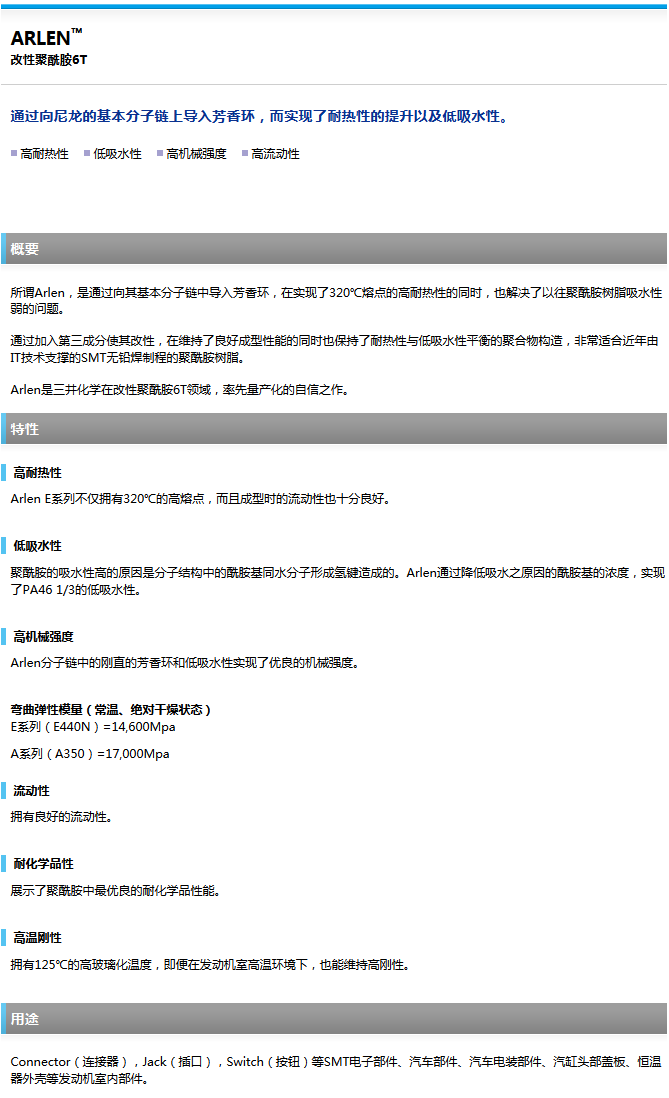 >> 日本三井ARLEN耐熱性尼龍PA6T工程塑料
