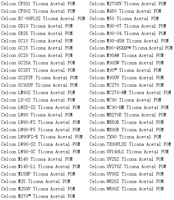 Celcon® POM產(chǎn)品有不同粘度的非填充級品級,以及玻纖增強(qiáng)、沖擊改性、抗UV、低光澤、靜電消散、低磨耗、抗漂白劑和可激光雕刻等特殊品級。有些特殊品級為燃油系統(tǒng)和供水管道應(yīng)用提供了特別優(yōu)異的性能。Celcon® 有符合FDA、UL和NSF標(biāo)準(zhǔn)的品級。符合美國藥典VI的醫(yī)療(MT?)品級是干粉吸入器、胰島素筆和其它醫(yī)療設(shè)備用材的杰出候選者,并已在美國藥物主文件檔案中列檔(DMF,No.16661)。所有Celcon® 產(chǎn)品都可以進(jìn)行幾乎任何一種配色,而且色料不含有重金屬元素,如鎘、汞、鉛、鉻(VI)等。由于它的多功能性,Celcon® 產(chǎn)品被廣泛地應(yīng)用在各種領(lǐng)域中,比如齒輪、彈簧、夾子、卡扣、門把、燃油系統(tǒng)部件的襯墊、玩具元件、洗衣機(jī)元件、手動工具部件、淋浴蓮花篷頭、安全帶卡扣等。Celcon® 亦可以用來制備薄板、圓棒和厚板等坯型材,并可通過機(jī)加工來制造高精度零件。
